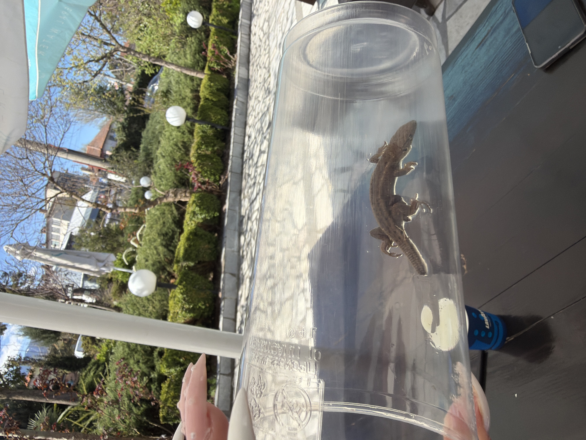 A lizard is trapped in a clear plastic container on a table. The container is tilted slightly to the left. Part of a hand with pink fingernails is visible at the bottom of the container, seemingly holding it. To the right of the container, a blue object with dark dots is also on the table. A cell phone is on the right side, above the blue object. Outside the table area, there is a view of an outdoor location with trees, bushes and white spherical lights along the walkway. Buildings can be seen further in the background. The location is Dolna banya, Bulgaria.