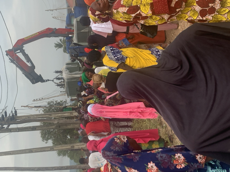 In Zango-ndaji, Nigeria, an outdoor scene depicts a large gathering of individuals observing an electrical infrastructure operation