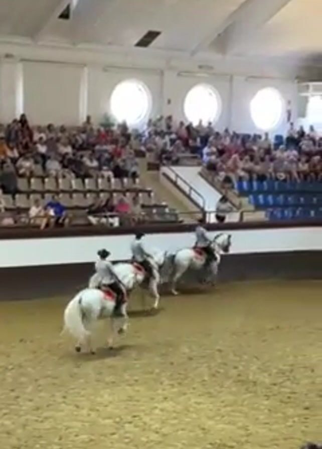 Three white horses perform in a sandy arena, ridden by people in cowboy hats. The horses have decorated saddles. A crowd watches from the bleachers. The arena is indoors with a high, white ceiling. Some people in the audience are filming the performance.