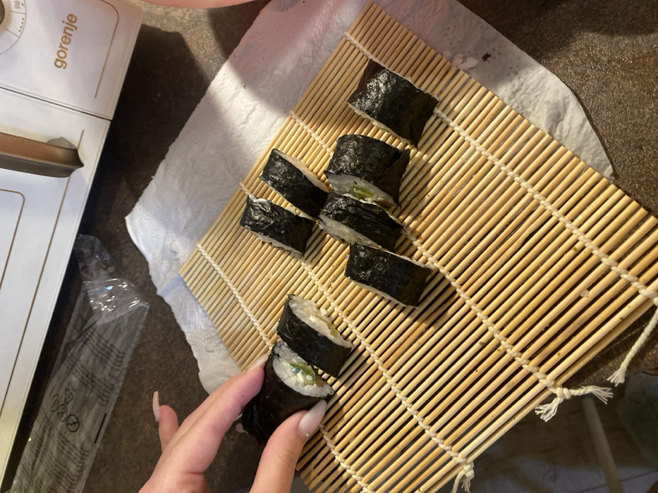 The image displays a food preparation scene in Silistra, Bulgaria. A light-colored bamboo sushi rolling mat is positioned centrally on a dark countertop. On the mat, a human left hand with light-colored, manicured fingernails holds a partially cut sushi roll composed of nori, white rice, and internal green and white fillings. To the right of this, eight individual, uniformly cut sushi pieces, identical in composition, are arranged in two rows on the mat. A crumpled white paper towel is visible underneath the right side of the bamboo mat. In the upper background, a white Gorenje branded kitchen appliance, appearing to be an oven or microwave, is partially visible, along with a clear plastic wrapper or bag on the dark surface.