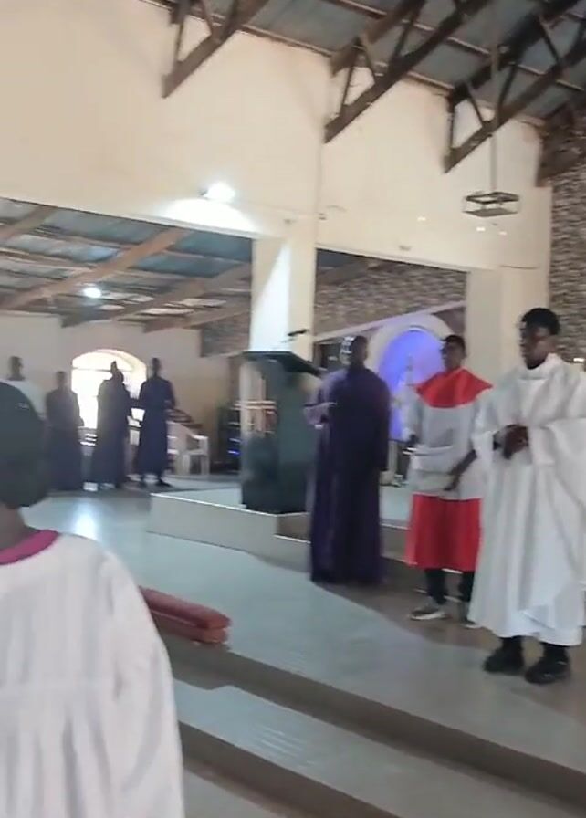 interior of a church. Several people, including three dressed in liturgical vestments, stand at the front of the church, near the altar. The other people, some wearing head coverings, are walking into the church. The church has a corrugated metal roof supported by wooden beams. A projector screen hangs from the ceiling at the front of the church, and there's a podium to the side. A man is visible at a keyboard, presumably playing music.