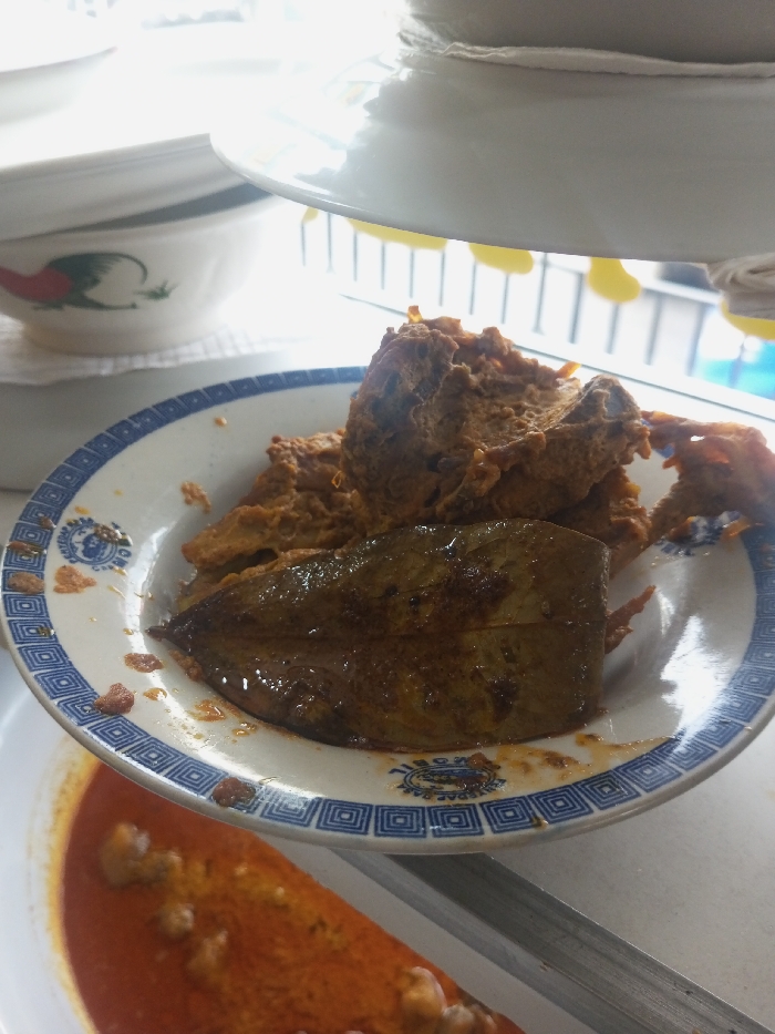 The image displays a close-up, slightly high-angle view of a meal served on a white ceramic plate in Kodarapalli, India. The plate, featuring a blue and white geometric border design, contains two primary food items: a flat, dark greenish-brown, glossy item, possibly a fish fillet or cooked vegetable, positioned towards the foreground-center; and a pile of irregular, textured, yellowish-brown food, likely meat or vegetable pieces in a thick sauce, located behind the first item. The plate's rim bears a partial inscription, including "KODARAPALLI." The environment indicates a dining setting. In the upper left background, a white ceramic bowl with a red and green rooster motif sits on a white cloth, with a stack of white plates visible behind it. Bright light from an unseen source originates from the upper left. The upper right background shows a partial white, inverted dish or lid, and a faint metal rack with yellow objects. The bottom of the image reveals a portion of another dish containing a reddish-orange curry with light-colored food pieces, alongside a metallic utensil handle. No individuals or specific actions are visible.