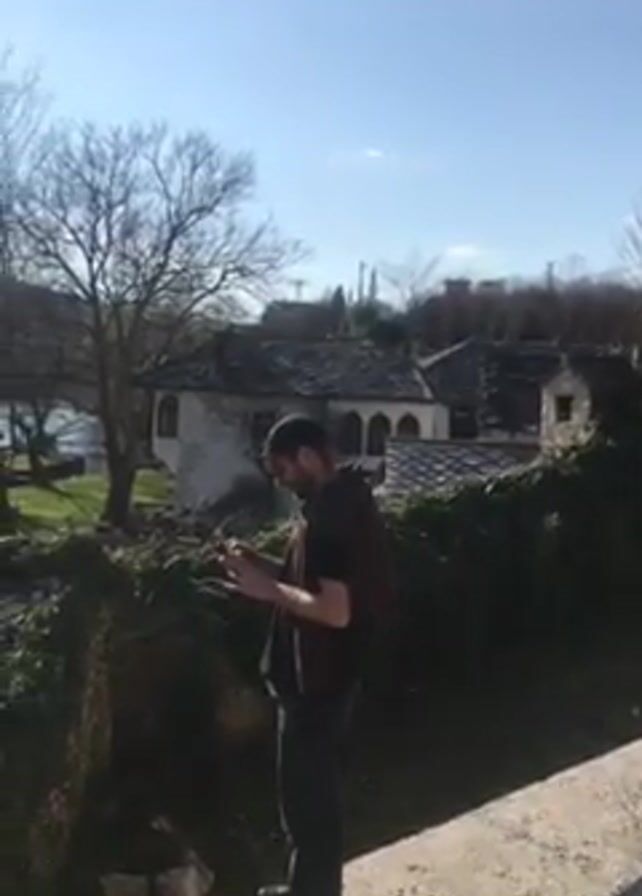 man standing on a concrete ledge in front of stone buildings with a view of a river and a mountain in the distance. The man is wearing a dark t-shirt, dark pants, and a jacket over his shoulders. He is holding a small object, possibly a phone, in his hands and looking at it. The stone buildings have dark tile roofs and are surrounded by greenery. The river flows through a green meadow with several trees in bloom. A mountain is visible in the background under a bright, clear sky.