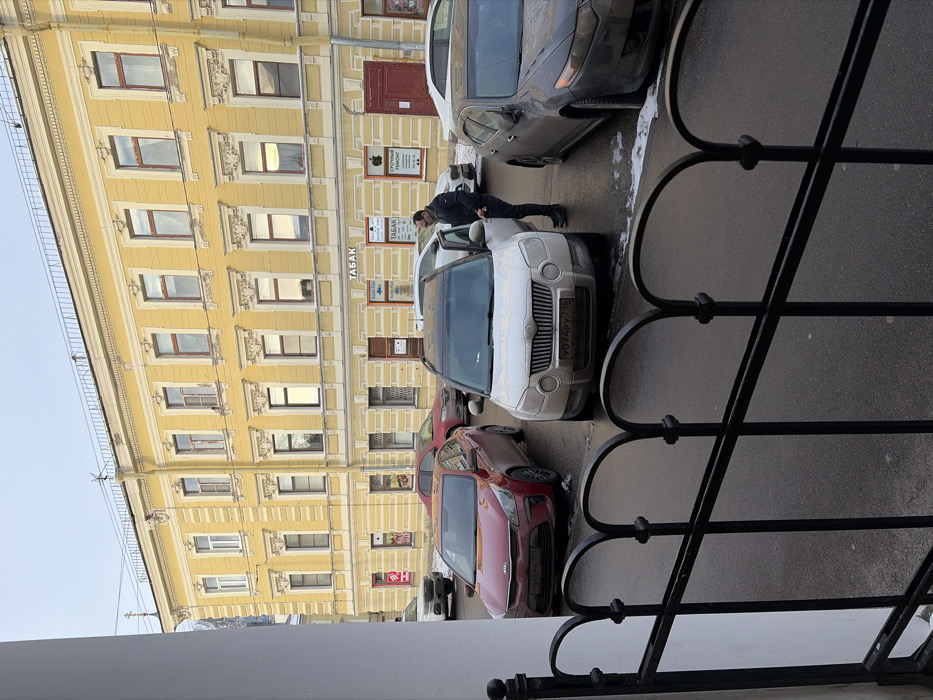 The image depicts an urban street scene in Kronstadt, Russia, under an overcast sky, with a wet asphalt surface and patches of melted snow/slush. In the background, a three-story, light yellow historical building with white decorative architectural elements and numerous windows serves as a backdrop. Its ground floor houses several commercial establishments, including one prominently displaying "ТАБАК" (Tobacco) in orange lettering, another with "Kofte Fish" signage, and a third with an Apple-like logo and text reading "ЯБЛОЧНЫЙ СЕРВИС" (Apple Service) and "СРОЧНЫЙ РЕМОНТ" (Urgent Repair). In the midground, multiple vehicles are parked on the street. A white Skoda Yeti SUV, bearing Russian license plate У074РУ 178, is parked front-center, facing the viewer, with its driver's side door open. To its left, a red Kia Rio sedan (Russian license plate К645РУ 178) is parked. To the right of the Skoda, a dark grey sedan is partially visible. Further back, a dark red sedan and a white SUV are also present. One adult male, dressed in a dark jacket and dark trousers, is standing beside the open driver's door of the white Skoda Yeti. He appears to be either entering or exiting the vehicle, or retrieving an item from its interior. His attention is directed towards the car's interior or the immediate vicinity of the door. The immediate foreground is partially obscured by a black wrought-iron fence featuring arched tops, and a white architectural column is visible on the far left.