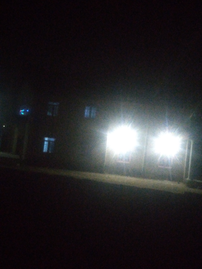 It's nighttime. A two-story building stands out due to bright lights emanating from the lower windows. Other windows on the building are visible, though much darker. The ground in front appears to be a yard or open space, receding into shadow. The overall image is dark, with the building's bright lights providing the only significant illumination.
