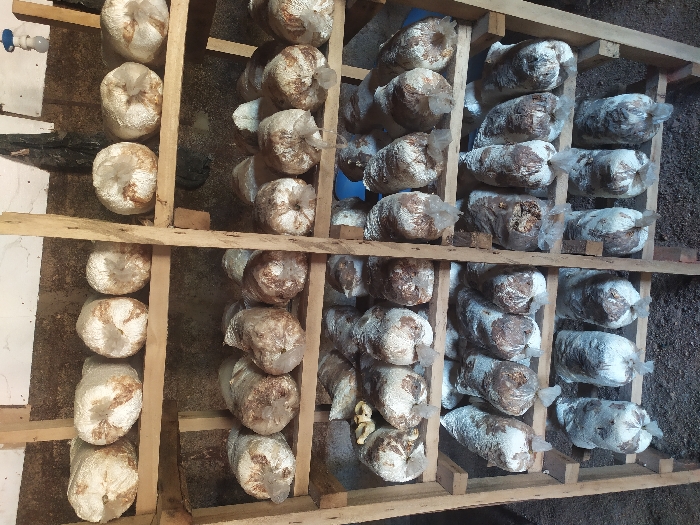 The image displays an indoor mushroom cultivation area