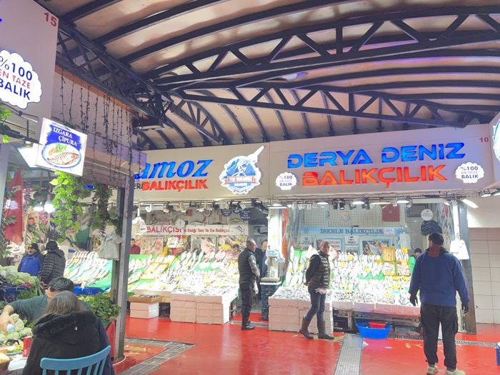 This image captures an interior view of a bustling fish market in Beyoğlu, Turkey