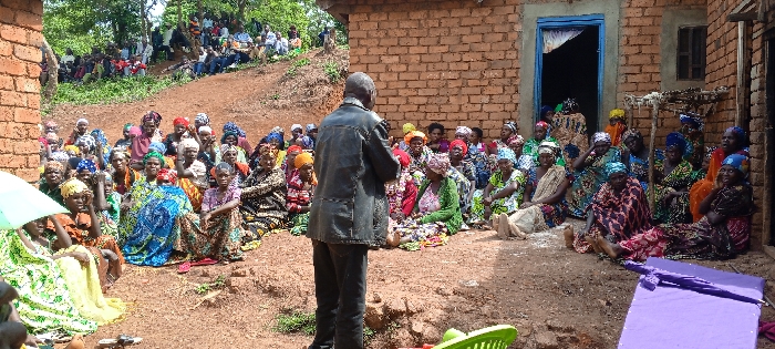 An outdoor community gathering is depicted in Namisha, Democratic Republic of the Congo
