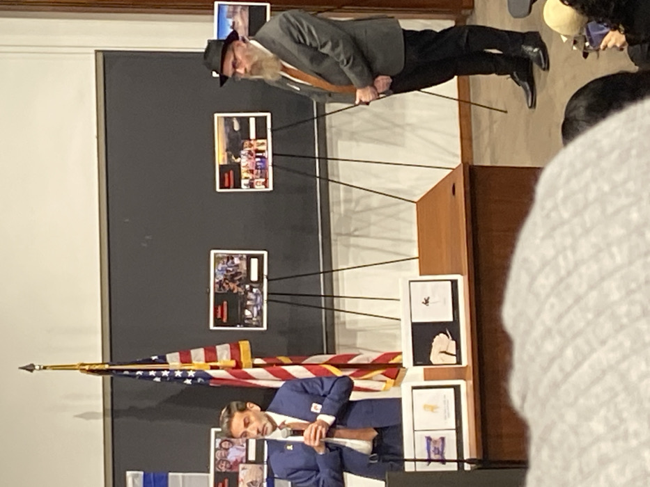 An indoor scene in a lecture hall or classroom in Princeton, United States, displays two men and several informational exhibits. On the left, a man with short dark hair and a trimmed beard, wearing a blue suit jacket, light brown tie, and a small yellow ribbon pin on his lapel, holds a microphone and appears to be speaking. To his right, behind him, an American flag with a golden finial stands on a pole. Positioned on a dark brown wooden table in front of the speaker are two framed displays. The left display features what resembles an Israeli flag alongside another image. The right display contains two smaller images, one depicting a hand, the other a simple sketch. To the right of the first speaker, an older man with a long light brown beard, glasses, and a black fedora-style hat stands attentively. He is wearing a grey suit jacket, a light brown tie, and black trousers, with his hands clasped in front of him. Behind both men, a large, dark blackboard or wall serves as a backdrop. Three framed display boards, each featuring multiple photographs and text, are mounted on black tripods. Faintly visible titles like "Haim" and "Aviv" appear on some of these boards, which present individual stories or themes. The flooring is carpeted in a light shade. The foreground shows the backs of several audience members' heads, with some individuals holding mobile phones.