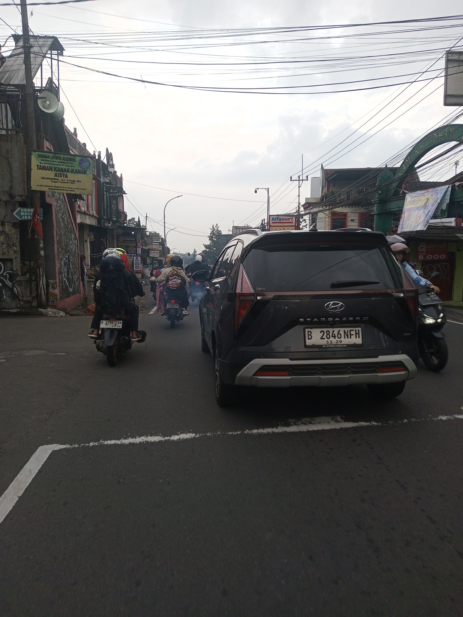 The image depicts a street scene in Ciherang, Indonesia. In the foreground, a gray Stargazer X car with license plate B 2846 NFH is stopped in traffic at an intersection with a white line marking the crosswalk. Several motorcycles are visible in the immediate vicinity of the car, two of which are immediately behind the car, and one of which is to the right of the car. On the left side of the street, there's a sign reading "YAYASAN LUTHFIA ALQORIA TAMAN KANAK-KANAK AISYA" along with a smaller sign pointing towards "GADO BOGO JAK". Across the street, there's an "Alfamart" store. Overhead, there are numerous power lines crisscrossing the sky. The sky is overcast. Other buildings and signage are visible in the background. The road surface appears asphalt.