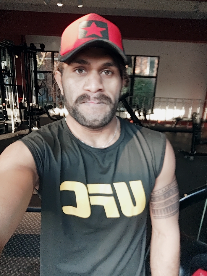 The image displays a male individual capturing a selfie within a gym setting, identified as being in the Chongqing High-tech Zone, China. The man has dark skin, dark eyes, and a mustache and beard. He wears a red and black baseball cap with a black five-pointed star on the front, a dark grey sleeveless shirt featuring a yellow "UFC" logo across the chest, and a thin silver chain necklace. A tribal-style band tattoo is prominently visible on his left bicep. He looks directly at the camera with a neutral expression. The background reveals various gym equipment, including weight machines, and large windows through which an exterior with trees and a building structure is partially visible. A red beam or wall section runs horizontally across the upper background. The flooring appears to be dark, textured gym matting.