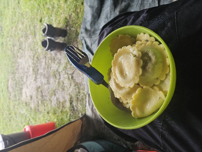The scene in Gavisse, France, presents an outdoor meal from a first-person perspective. A neon green bowl, filled with light yellow, scalloped-edge ravioli lightly coated with a sauce and sprinkled with dark specks (likely herbs or pepper), rests on a person's lap, covered by dark fabric pants. A blue multi-tool, configured as a fork, is positioned inside the bowl. In the immediate background to the left, the entrance of a tan camping tent is partially visible. To the right of the lap, a dark green tarp covers a section of the ground. The wider background consists of an outdoor area with sparse green grass and patches of exposed dirt. A black container and a red cylindrical object are partially visible near the tent opening on the far left. A pair of dark brown hiking boots are placed on the grass in the center-right background.