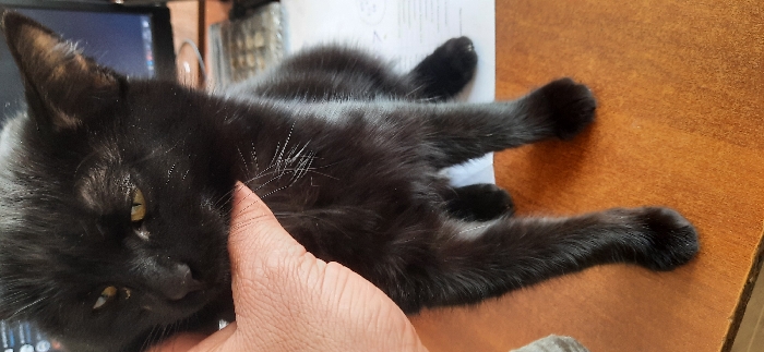 - "A black cat sprawls on a desk, appearing relaxed" by FM-0zE9q2, licensed under CC BY 4.0