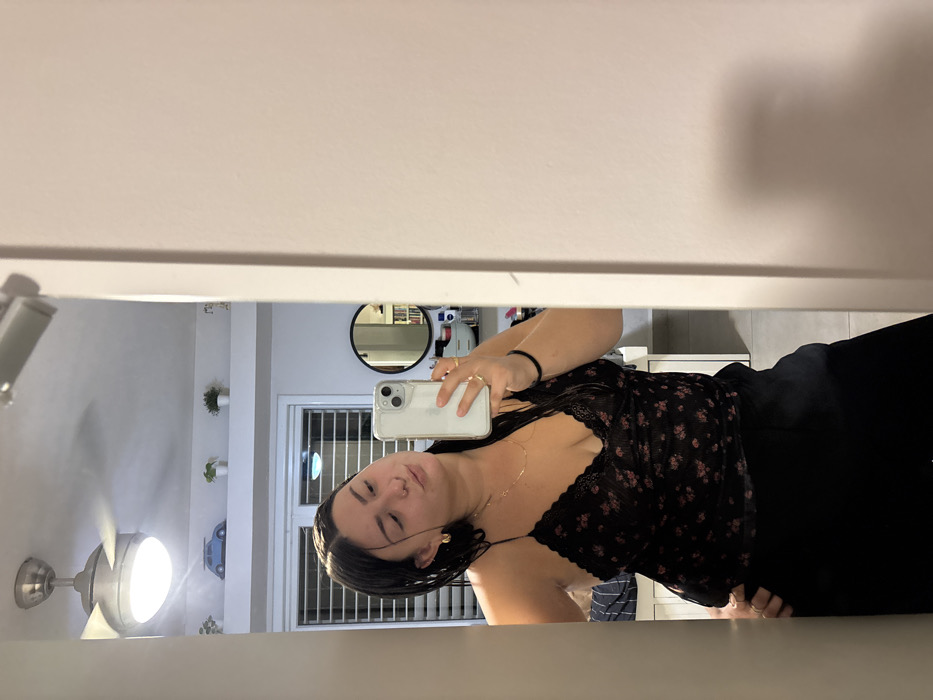 A female subject is depicted in a mirror selfie taken indoors within Ramat HaSharon, Israel. She possesses dark, wet hair styled with a center part and wears a black, lace-trimmed camisole adorned with small red floral patterns, paired with black trousers. Her right hand holds a smartphone, encased in a clear cover, towards the mirror, while her left hand is positioned on her hip. She wears gold hoop earrings, a gold chain necklace, a nose stud, and a ring on her right hand, with her lips slightly pursed. The background visible in the mirror's reflection includes light-colored walls and a window fitted with horizontal blinds. A white shelf above the window displays a small blue toy car with a surfboard and two potted plants. A light gray ceiling fan with a central light fixture is mounted on the white ceiling. To the right of the subject's reflection, a smaller, dark-framed circular mirror is visible above a counter holding several personal care items. A track light fixture is partially visible above the main mirror.