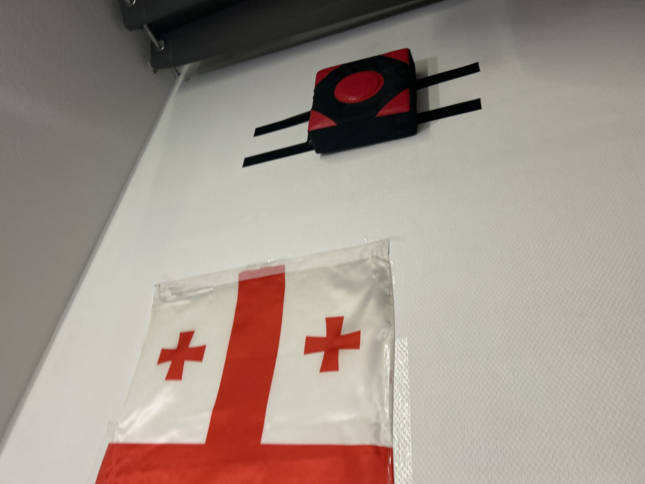 This image depicts an indoor scene in the city of Metz, France, showcasing a section of a white wall with a subtle textured pattern. On the left, a flag representing the national flag of Georgia is affixed to the wall, secured by transparent adhesive at its upper corners. The flag displays a white field with a prominent red St. George's cross extending to the edges, and four smaller red Bolnisi crosses situated in each of the four white quadrants. To the right of the flag, a square-shaped object, primarily black with red accents, is mounted vertically on the wall. This object features a central red circular element surrounded by four red triangular sections on its face. It is secured by two distinct black vertical straps, one positioned above and one below the object. A dark grey curtain, suspended from a rod, is visible along the far right edge of the frame, partially obscuring the corner. A white ceiling line runs horizontally across the top portion of the scene.