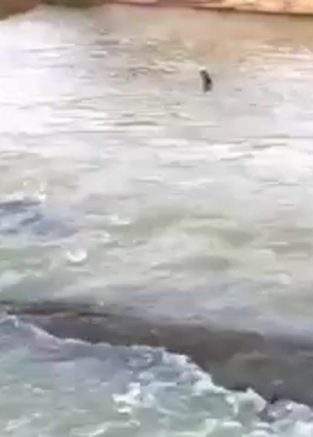 A man stands beside a river, looking to the right. The river is shallow, with some rocks visible in the water. The water is moving quickly, creating small waves. The surrounding area appears to be rocky and somewhat barren.