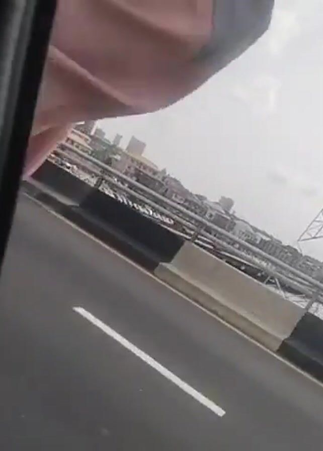 From inside a moving vehicle, likely a car, the view is from the front passenger seat. The vehicle is traveling on a bridge over water. On the right side, there's a concrete barrier and a metal railing. Beyond the railing is water and a cityscape in the distance. The sky is overcast. The person holding the camera is wearing a light pink jacket. The focus is on the view from the window as the car moves across the bridge. A tall metal structure resembling a utility tower is visible in the distance.