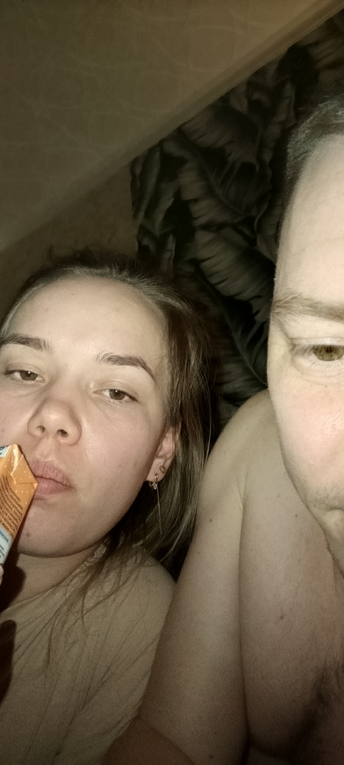 A dimly lit selfie features a woman and a man
