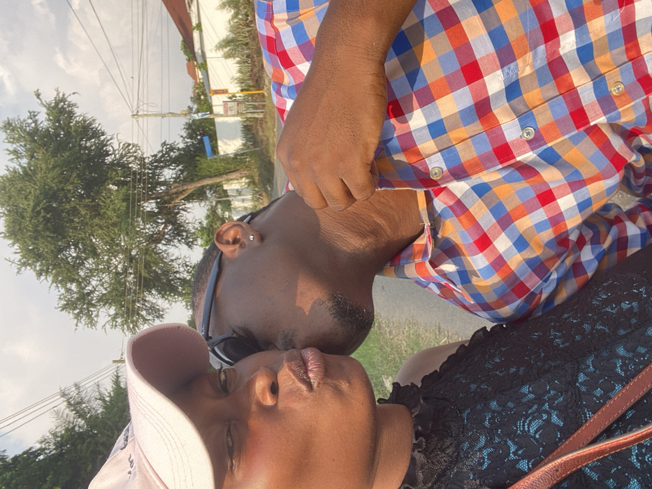 A couple is posing intimately. The woman wears a light pink cap and a dark teal lace top. The man wears a checkered shirt with red, blue, and yellow squares and has black sunglasses perched on his head. They appear to be outside, with trees and buildings visible in the background. The photo seems candid and personal.