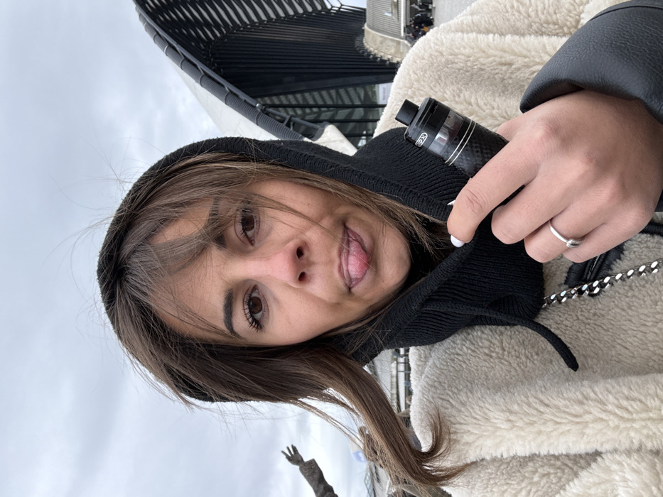 An individual, identified as female, is depicted in a close-up, outdoor photograph at the Gare de Lyon-Saint Exupéry TGV station in Colombier-Saugnieu, France. She has brown hair with bangs, partially covered by a black hooded garment, and is seen extending her tongue in a playful expression. She wears a cream-colored fleece jacket over a dark garment, with a black quilted chain-strap bag visible on her left shoulder. A plain silver-colored ring is present on her left ring finger. In her right hand, she holds a black and silver vaping device, clearly branded "GEEK VAPE." The background features the distinctive modern architecture of the TGV station, characterized by a white curved structure with prominent dark, ribbed elements on the right. To the left, a large bronze-colored statue with an outstretched arm is partially visible. The sky is overcast, indicating a cloudy day. Indistinct human figures are present in the distant background.