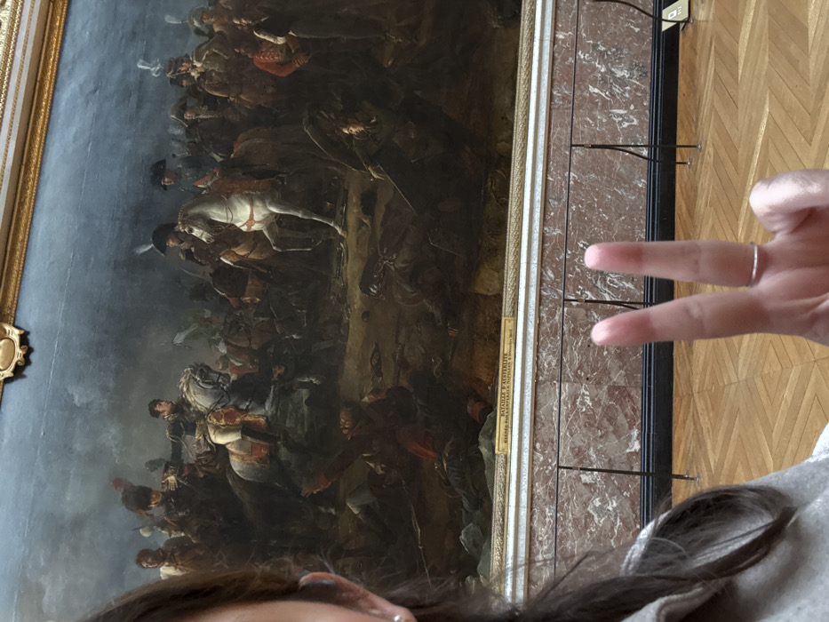 A forensic description of the image reveals a large historical oil painting, titled "BATAILLE D'AUSTERLITZ" (Battle of Austerlitz), hanging on a wall within the Palace of Versailles, France, specifically in the Galerie des Batailles (Gallery of Battles). The painting depicts a tumultuous 19th-century battle scene with numerous soldiers on horseback and foot, engaged in combat, under a dark, overcast sky. Prominent figures include a commander on a grey horse on the left, gesturing with an outstretched arm, and another on a rearing white horse on the right. Fallen or wounded soldiers are visible on the ground. The painting is set in an elaborate golden frame with a decorative gold crest at the top. Below the painting, a narrow black metal railing with multiple vertical supports separates viewers from the artwork. Below the railing is a section of reddish-brown marbled wainscoting. The floor is a light-toned wooden parquet laid in a herringbone pattern. A person is partially visible in the foreground, with their left ear and a portion of their face visible on the far left, wearing a small silver stud earring. Their right hand is prominent in the lower center, forming a two-fingered "V" or peace sign, with a thin silver ring on the fourth finger. A light-colored garment, possibly a jacket or hoodie, covers their shoulder.