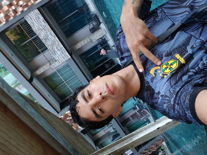 A male individual with short dark hair and a subtle mustache is prominently featured in a selfie, looking directly into the camera. He wears a dark blue and black patterned short-sleeved shirt displaying the yellow and green emblem of the Brazilian Football Confederation with the word "BRASIL" on its left chest. His left hand is raised, forming a "peace" or "victory" gesture. A dark strap is visible across his torso, and a faint tattoo is present on his left forearm. The scene is set at a modern resort in Patong, Thailand. Immediately behind the individual is a turquoise-blue swimming pool, reflecting light. In the background, a multi-story hotel building with contemporary architecture is visible, featuring grey exterior walls, dark-framed glass sliding doors, and balconies. These balconies are adorned with light-colored stone cladding and metal railings. On a lower balcony, a person is seated at a table, and another individual is partially visible within the swimming pool. An overhead metal beam and wooden ceiling structure are present in the upper left of the frame, suggesting the photograph was taken from a covered area adjacent to the pool. Green foliage is visible beyond the resort structures.