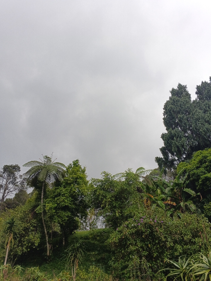 Lush green vegetation fills the lower half, featuring diverse trees, bushes, and ferns. A tall, slender fern tree with a distinctive canopy stands out. To the right, denser foliage includes banana trees and taller evergreen trees. Overcast skies occupy the upper half, creating a muted, somewhat somber atmosphere. The scene suggests a tropical or subtropical environment with a rich, varied ecosystem.