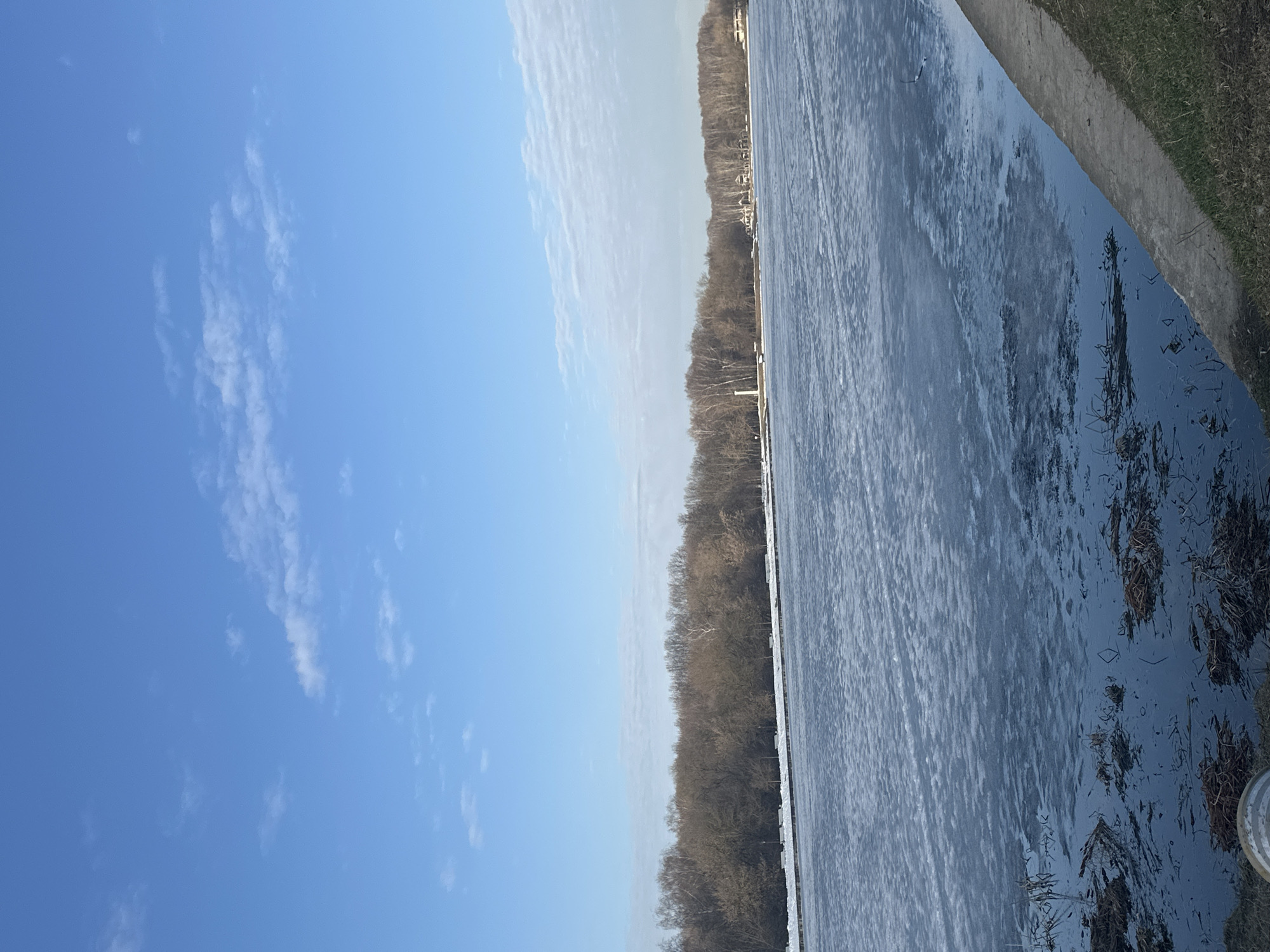 landscape with a clear blue sky on the left and a partially frozen body of water on the right