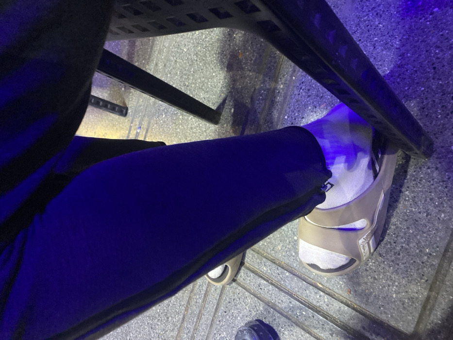 A person wears dark-colored pants and a sock with a dark logo on the ankle. The person is also wearing sandals with holes in the upper part. The person is sitting at a black table with a mesh top. The floor is gray.