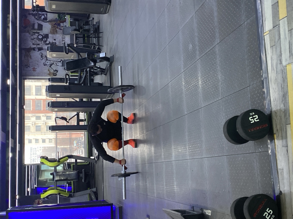 The image displays a male individual performing weightlifting inside a fitness gym located in Guta, China