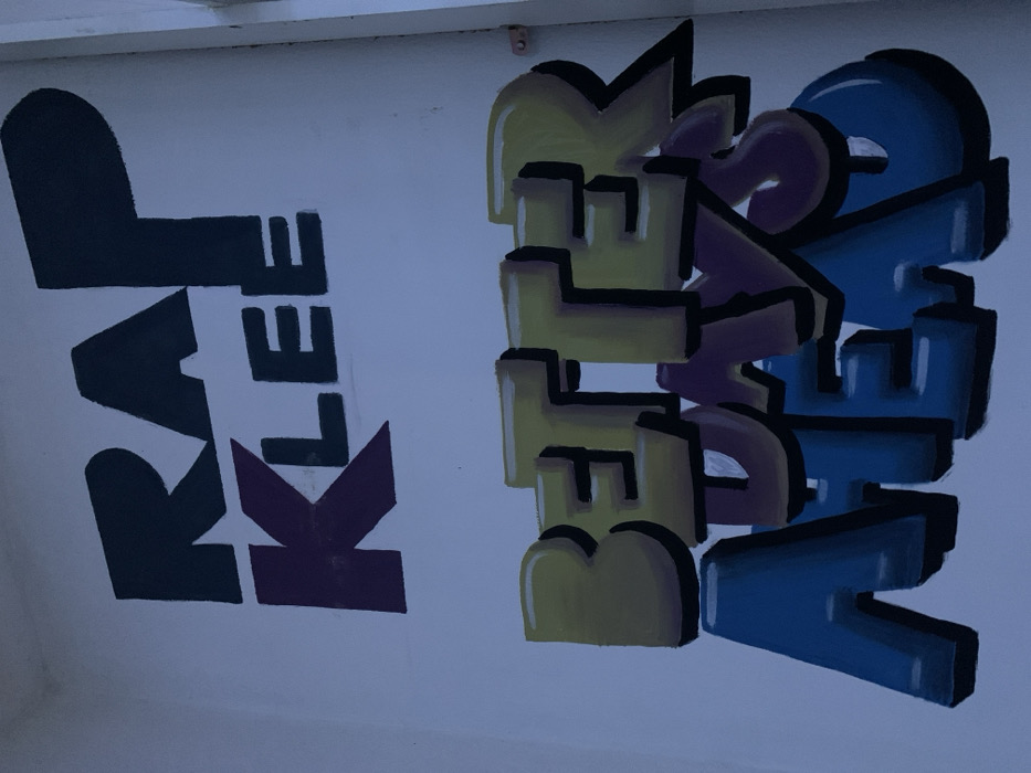 The image displays two separate sets of stylized lettering. The first group spells "RALEE" in dark colors. The "R" is black, "A" dark green, "L" black, "E" black, and the second "E" is burgundy. The second group of text says "BETTER DAYS" in stacked, outlined block letters. "BETTER" is yellow, "DAYS" is blue, and there is a darker purple drop shadow on "DAYS". Both phrases are on a pale blue or white background.