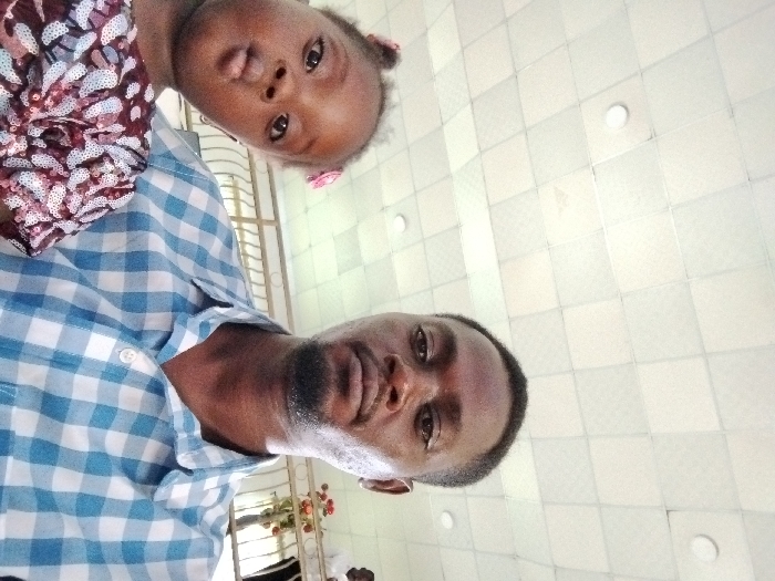 An adult male and a young girl are depicted indoors in Kabong, Nigeria, both looking directly at the camera