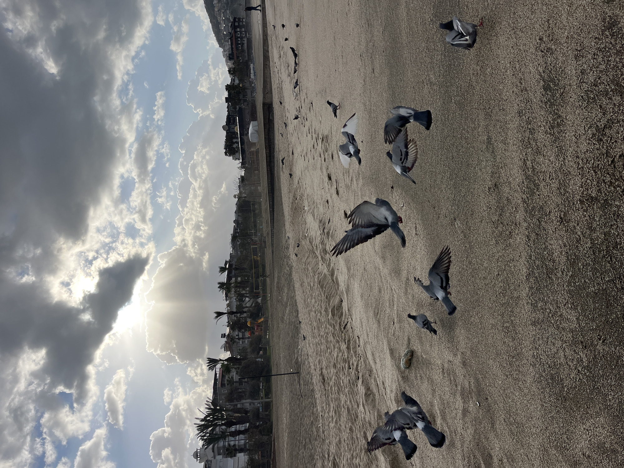 The image captures a sandy beach in Alanya, Turkey. The perspective is slightly tilted. Numerous pigeons are scattered across the beach, some in flight and others stationary. In the background are buildings and palm trees, with cloudy skies overhead and sun rays breaking through the clouds. A few distant figures of people can be seen on the beach.