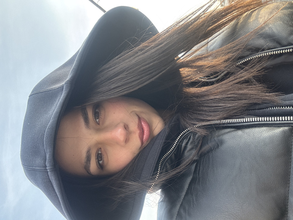 A single female individual is depicted in a close-up, chest-up outdoor portrait, presumably taken in Gabrovo, Bulgaria. The subject, with medium skin tone, has dark brown hair, brown eyes, and a slight smile. She is wearing a dark-colored hooded garment with the hood up, over which she wears a black puffer vest or jacket with a visible, partially unzipped silver-toned zipper. Her hair falls around her shoulders and chest. The background is out of focus, revealing a light blue sky. The lighting on the subject's right side suggests an outdoor setting with natural light.