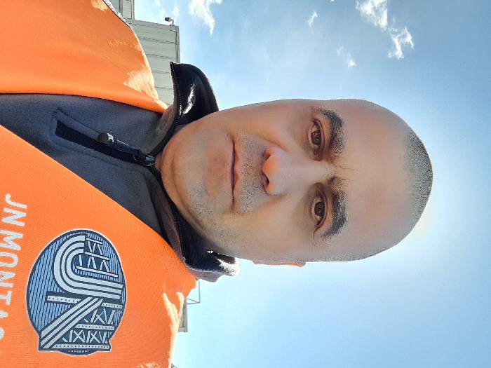 A medium close-up photograph depicts an adult male from the chest up, centered in the frame. The man has a bald head, dark eyebrows, brown eyes, and visible stubble on his face, maintaining a neutral expression while looking directly at the camera. He is wearing a grey zip-up fleece jacket with a black collar, over which an orange high-visibility vest is worn. On the right chest area of the vest (viewer's left), there is a blue and white oval logo displaying stylized letters "JN" resembling structural elements, with the text "JN MONTAG" partially visible in white below it. The background consists of a clear blue sky with sparse white cumulus clouds, illuminated by bright overhead sunlight creating a slight lens flare or halo effect around the man's head. In the upper left background, behind the subject's left shoulder, light-colored industrial buildings or structures are partially visible, with a small, dark cylindrical object, possibly a security camera, mounted on a pole or structure. The scene is outdoors in the city of Unknown, Unknown.