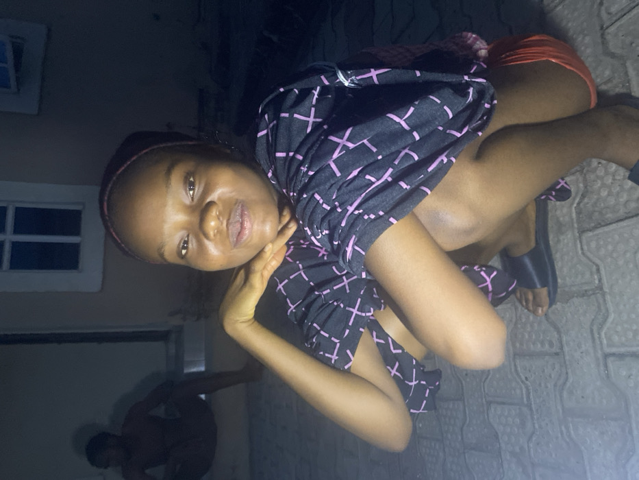 A woman poses outdoors at night. She wears a black and pink cross-patterned dress, reddish shorts, and black sandals. Her hand rests on her neck as she looks directly at the camera. A building with two windows is visible in the background. A blurry figure is squatting in the lower left corner of the image. The ground appears to be tiled.