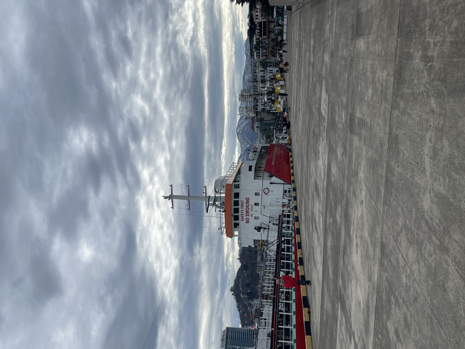The image depicts a port area in Batumi, Georgia, on an overcast day. A wide, grey concrete pier occupies the foreground and midground. To the left, a large, white and red vessel is docked, featuring a white superstructure with orange trim, a prominent mast, and "SAFETY FIRST" and "NO SMOKING" signs on its side, along with "IMO 9763640". A single individual wearing a red jacket walks across the pier from left to right, near the vessel. In the distant midground, additional pedestrians are visible walking on the pier. The background displays the city's architecture, including modern high-rises and a historic structure on a hill to the left, and a row of diverse buildings along the waterfront to the right. Snow-capped mountains are visible in the far background beneath a dense, cloudy sky.