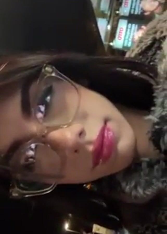 A woman wearing large glasses and pink lipstick looks at the camera in a close-up, low-angle shot