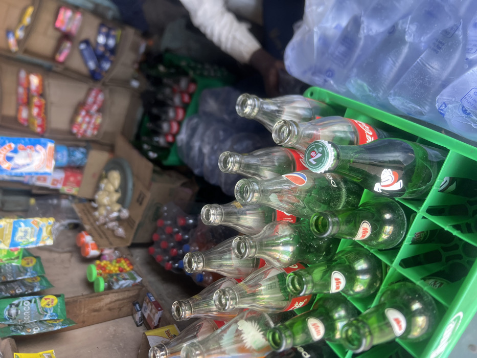 The image portrays the interior of a compact provision shop or market stall in Maiburiji, Nigeria. In the foreground, a green plastic crate contains approximately sixteen empty glass beverage bottles, including brands such as Coca-Cola, Pepsi, and 7-Up, with some exhibiting residual liquid. To the right of the crate, a stack of clear plastic water bottles, individually encased in plastic, is visible. The midground features more empty plastic bottles with red caps stacked in another green crate, behind which a large dark bundled object is present. The lower right reveals the arm and leg of an individual, dressed in a white long-sleeved garment and dark trousers. The cluttered background showcases a wooden-walled shop, displaying various packaged goods: several green and yellow packets (e.g., "DORCO," "Dudu-Osun") hang, while other snacks, small orange tubs, and a tray of light-colored pastries are arranged on cardboard boxes and makeshift shelves.