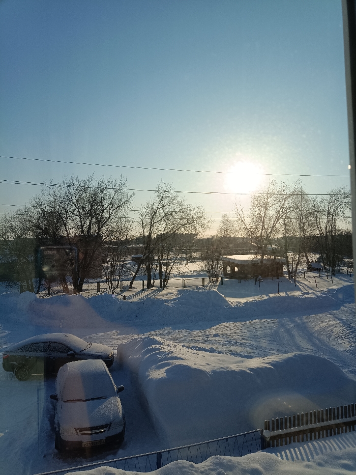 A winter scene shows two cars parked in snow-covered driveway. The ground is blanketed with deep snowdrifts. Bare trees stand in the background against a bright, sunny sky. A small structure, possibly a gazebo, is visible through the trees. A wire fence is in the foreground, also dusted with snow. The overall impression is one of a cold, clear winter day.