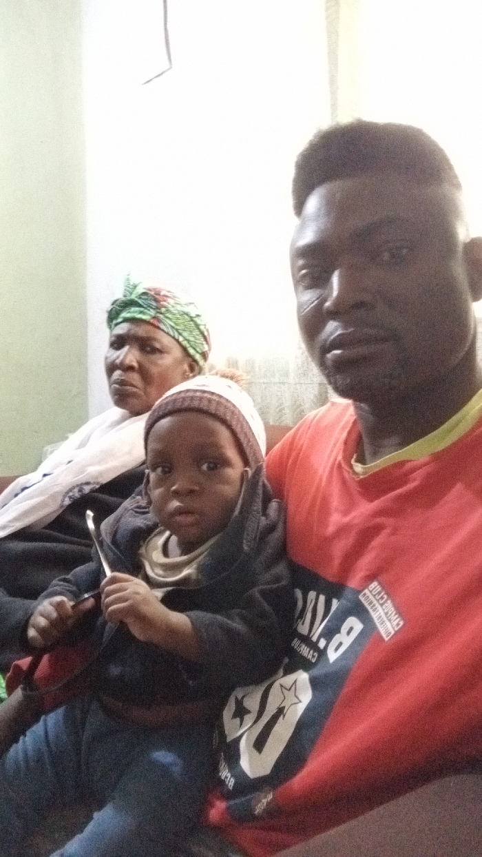 An indoor medium shot, taken in Unguwan Dosa, Nigeria, depicts three individuals seated. On the right, an adult male with dark skin and short dark hair wears a red short-sleeved t-shirt featuring a white and black graphic design including the letters 'B.Y.O.' He looks directly into the camera. An infant, also with dark skin, is positioned in front of the adult male, wearing a light-colored knitted beanie with a pompom, a dark long-sleeved jacket, and a light undershirt. The infant holds a metallic spoon in the right hand and looks towards the camera. To the left, an older woman with dark skin wears a green, orange, and white patterned headwrap and a white shawl draped over a dark garment. She faces slightly left of the camera. The background consists of a plain, light-colored wall.