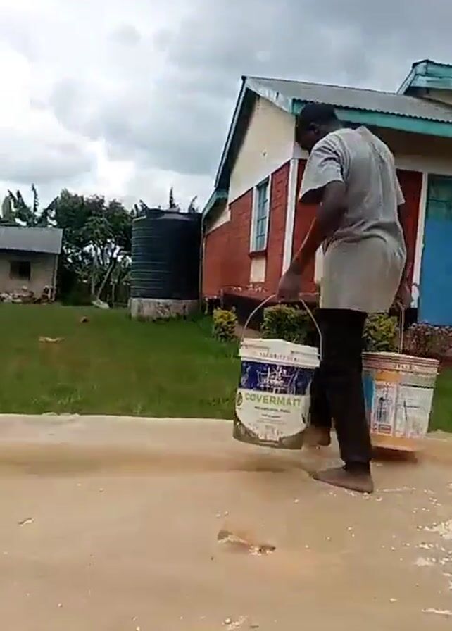 man carrying two buckets. The man is barefoot and wearing dark pants and a gray t-shirt. He carries one bucket in each hand. The buckets are paint buckets and have metal handles. The man walks on a concrete path next to a grassy area. In the background are buildings, including a red brick building with a light-colored roof. There is a large water tank behind the red brick building. The sky is overcast. The man walks away from the camera and stops briefly before exiting the frame.