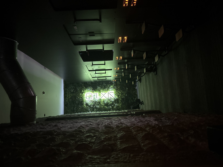 A distorted perspective captures a dark interior. A low-angle view reveals a ceiling with protruding equipment and lights, contrasted by a textured floor. On the left, a cylindrical pipe intersects with a wall. "OLXN" is illuminated against a foliage wall in the distance. The right side features a dark, vertical wall. The overall composition creates a sense of depth and an unconventional, almost surreal, spatial arrangement.