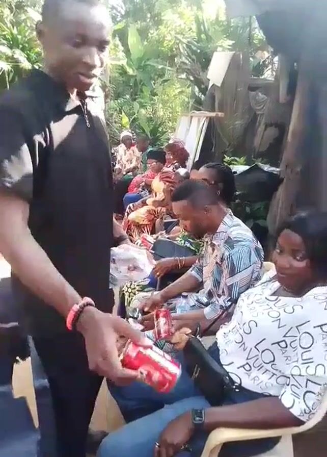 A man wearing a black shirt is handing out cans of Coca-Cola to people seated in chairs. The group of people are assembled in what appears to be an outdoor setting with trees and structures in the background. Many are dressed casually. The sun is bright and partially obscuring the image.
