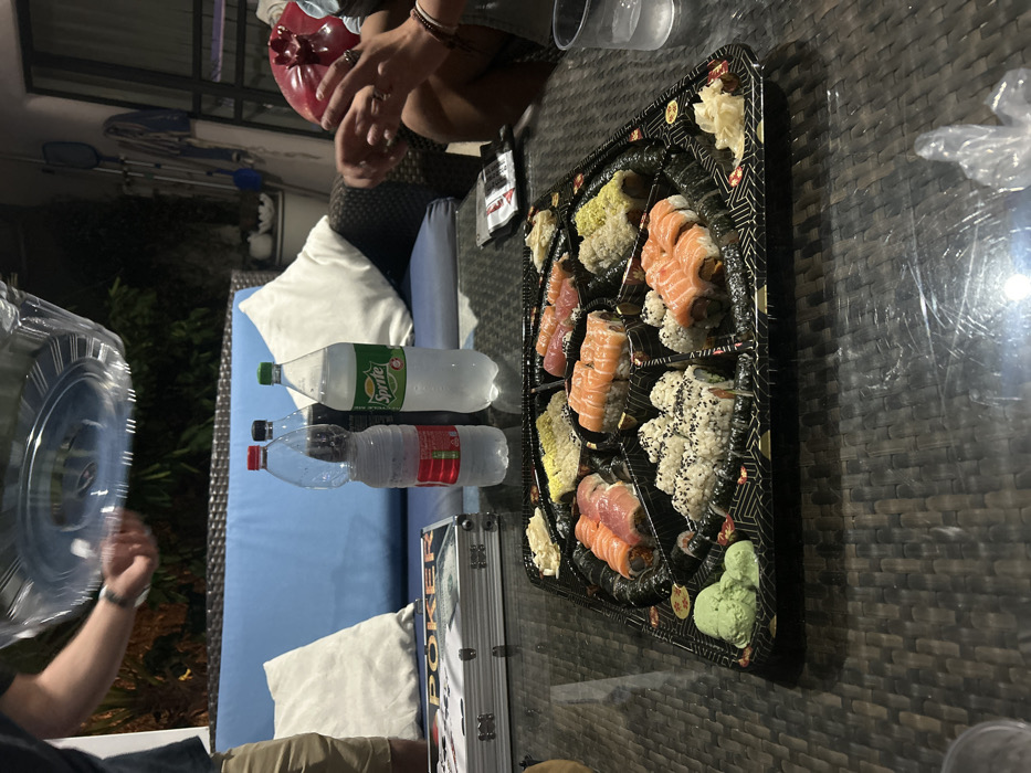 An outdoor evening scene is depicted on a residential patio in Yehud Monosson, Israel. A dark, woven-patterned glass-top table occupies the foreground, displaying a large black compartmentalized sushi platter. The platter holds multiple varieties of sushi rolls, including those with salmon, tuna, and rice coated in black sesame seeds, alongside portions of green wasabi and pickled ginger. Behind the sushi platter, three plastic beverage bottles stand on the table: a clear water bottle, a dark soda bottle, and a Sprite bottle. To the left, a silver metallic case labeled "POKER" is visible. Two individuals are partially visible: 1. On the left, a person wearing a light top and khaki shorts is seen from the chest down, holding a transparent plastic dome lid above the table. 2. On the right, another person is partially visible from the chest down, with hands holding a red, spherical, textured object. This person wears a ring on the left hand and a bracelet on the right wrist. A transparent plastic cup containing ice and liquid is also present on this side of the table. In the background, a blue cushioned outdoor sofa with white pillows is positioned against a dark backdrop of foliage and residential elements, illuminated by artificial light, indicating a nighttime setting.