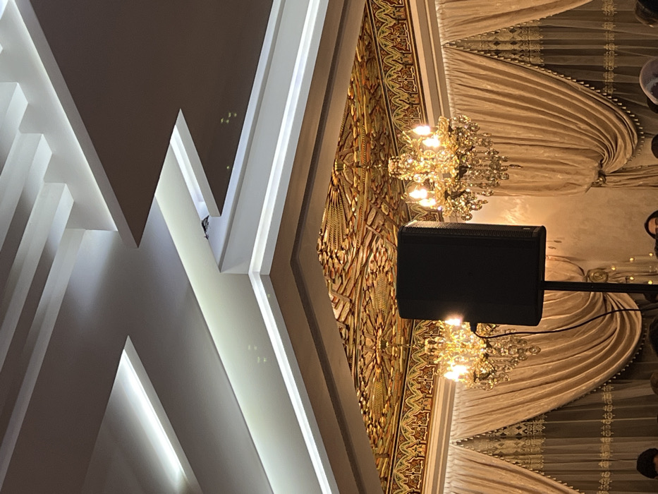 An angled, upward shot features intricate ceiling architecture, ornate gold patterns, and shimmering chandeliers. The left side displays a white, sharply geometric design with integrated lighting. To the right, detailed golden patterns adorn the ceiling. A large black speaker interrupts the view, positioned in front of a chandelier and draped beige curtains, adding a modern element to the elaborate, traditional setting.