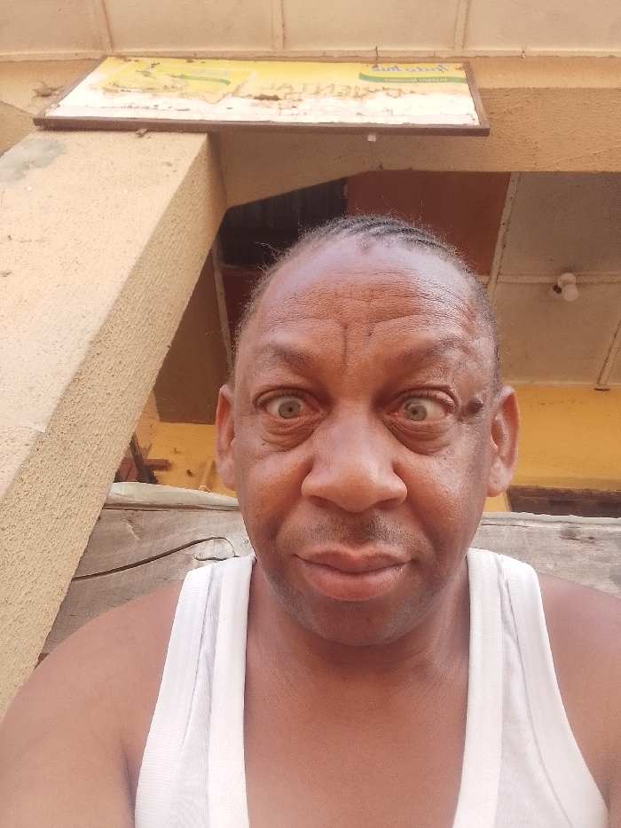The image displays a close-up, chest-up self-portrait of an adult male in an outdoor or semi-enclosed setting within the city of Narayi, Nigeria