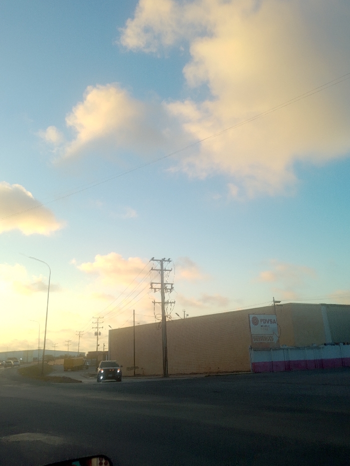 The image depicts an urban-industrial scene at dusk or dawn in Puerto Cabello, Venezuela. The perspective is from a vehicle, with a dark asphalt roadway dominating the foreground. A dark-colored SUV or pickup truck, with illuminated headlights, is positioned in a turn lane or at an intersection in the midground, facing generally towards the viewer's right. Further left on the road, a yellow truck is partially visible. To the right of the roadway, a large, light-brown or beige industrial building is a prominent feature. A sign is affixed to the building's facade, displaying the circular PDVSA logo with "PDVSA" and "MEJOR LA" text, and the word "BIENVENIDOS" (Welcome) below it. A low barrier, painted in alternating white and pink horizontal sections, stands in front of the building. Multiple utility poles with numerous crossarms, transformers, and electrical wires are visible along the right side of the road, with one pole particularly dense with infrastructure positioned near the center-right. A tall, curved street lamp post stands on the far left. The sky overhead is light blue, transitioning to a warm yellow-orange hue near the horizon, with scattered cumulus clouds. Faint, low-lying terrain is visible on the far-left horizon. No individuals are discernible.