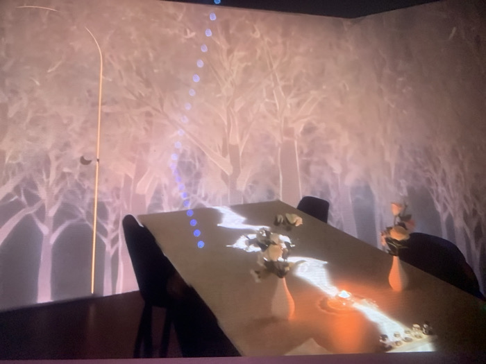 The image displays an indoor dining setting in a venue located in Donetsk, Ukraine. A large, light-colored table, likely rectangular, occupies the foreground and midground, oriented diagonally with its far end towards the upper right. Several dark-colored chairs are positioned around the table. On the table surface, multiple vases hold floral arrangements; one vase contains light-colored (white/cream) flowers, while another holds peach-toned roses. A prominent warm light source, possibly a candle or small lamp, is situated towards the right side of the table, casting an orange glow and illuminating a cluster of small, reflective circular objects. The walls in the background feature an extensive projection or wallpaper depicting numerous stylized, bare trees with intricate branches, rendered in white or very light tones against a darker, diffused background. A thin, vertical, luminous golden strip is visible on the far left of the image. Additionally, a series of small, glowing blue circular lights descends vertically in a slightly curved line from the top center of the frame towards the table. No individuals are present in the scene.
