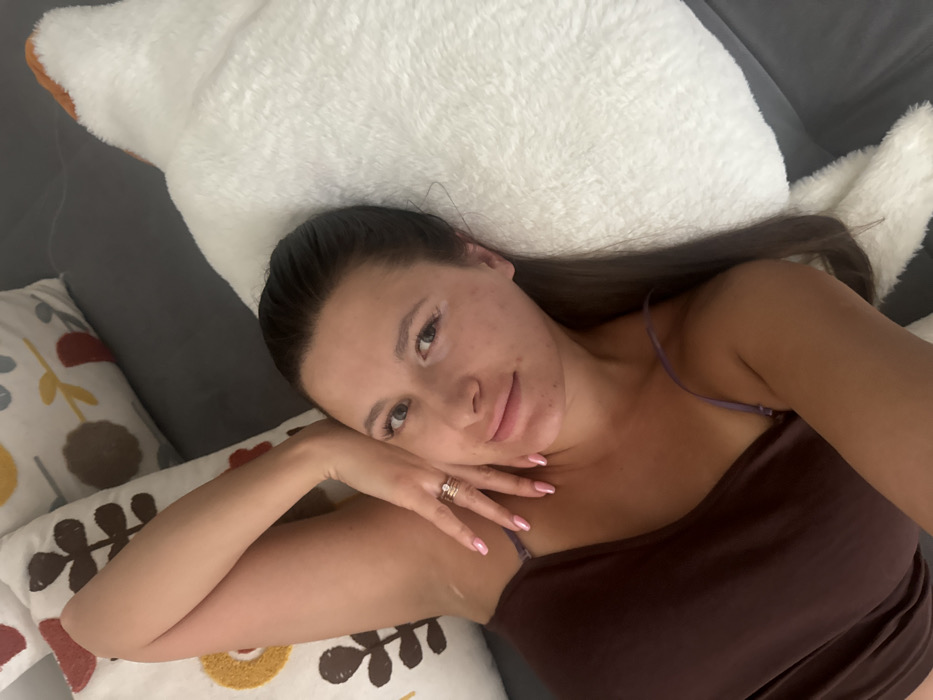 The image depicts an adult female subject positioned supine on a dark gray surface, likely a bed or sofa, within an indoor environment in Odintsovo, Russia. Her head rests on a fluffy white pillow, and her body is angled slightly toward the left. She is looking directly at the camera with a neutral facial expression. The subject has dark brown hair pulled back, visible eyelashes, defined eyebrows, and minor blemishes on her facial skin. She is wearing a dark brown or maroon camisole top with thin purple shoulder straps. Her left arm is bent, with her left hand positioned near her face, fingers slightly splayed. A ring, appearing to consist of multiple bands with a central light-colored stone, is visible on the fourth finger of her left hand. Her fingernails are manicured with a light pink polish. To the subject's left, two square pillows are present, featuring white covers with abstract floral or leaf patterns in brown, orange, and yellow hues. The lighting is even, consistent with an interior setting. No other individuals or significant objects are visible, and no dynamic interactions are depicted.